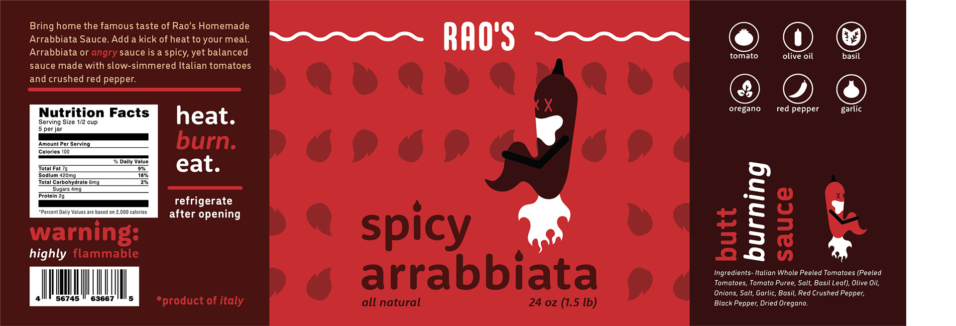 A REBRAND AND PACKAGING CONCEPT FOR RAO'S, THE OH-SO GOOD, PASTA SAUCE. THE CAMPAIGN IS INTENDED TO BRING YOUNGER GENERATIONS INTO THE KITCHEN THROUGH JARRED SAUCE AND CORNY JOKES. EACH FLAVORS DESIGN IS INSPIRED BY THE INGREDIENTS INSIDE THE SAUCE, ALL IN ATTEMPTS TO MAKE COOKING LESS INTIMIDATING.